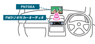 音声信号をFM電波に変換して送信するFMトランスミッターを内蔵。ナビに接続したDVDプレーヤー等の音声は本体のスピーカーで楽しむこともできますが、FMトランスミッターを使って、お車のFMカーオーディオの迫力あるサウンドで楽しむことができます。