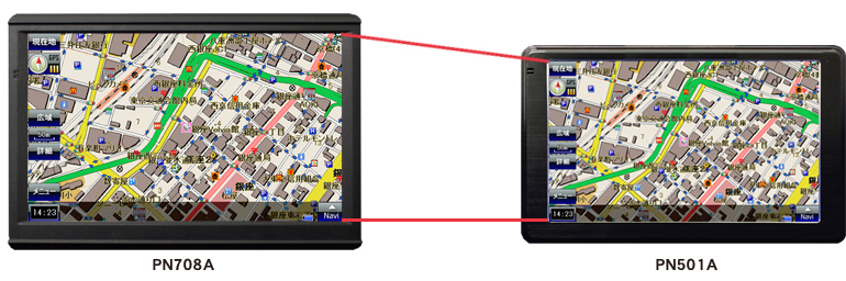 従来のQVGA液晶の約5倍に相当するきめ細かさで、込み入った市街詳細地図もきれいに表示。目的地まで安心してドライブが楽しめます。